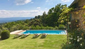 Outside the Villa you will find a shaded terrace with a table for at least 8 people where you can have lunch, dinner or just a relaxing siesta. The terrace has beautiful panoramic views at the pool area and the surrounding countryside, and can be directly accessed from the kitchen as well as the living room. The sun terrace is equipped with custom made upholstery for comfortable hours enjoying the incredible view. The large 10 x 4 swimming pool (which can be also heated) is situated in a large one hectare park-style garden with old pine trees and lavender patches. The numerous trees provide plenty of shady Corners. There are ample sun-beds and lounging chairs and an XL modern sun umbrella for those who prefer the shade. There is an extensive parking/boules/badminton area in front of the house and a ping-pong table is available too.